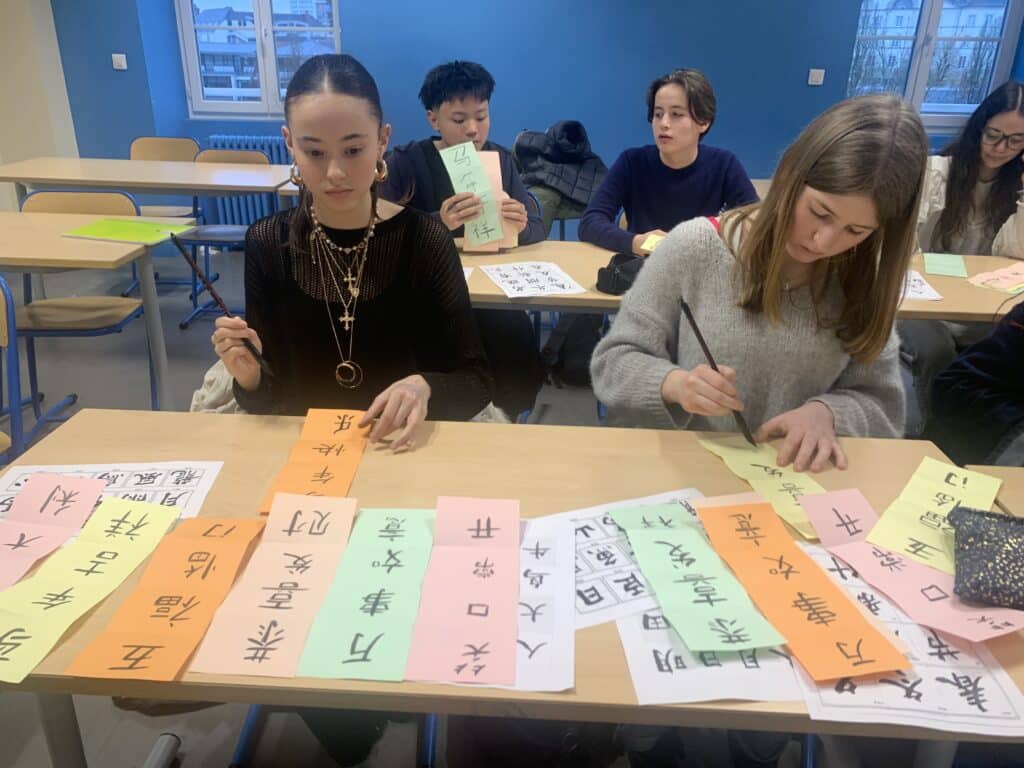 À la découverte des traits et de l’encre, les élèves ont exploré cet art traditionnel chinois. Patience et précision étaient nécessaires pour tracer chaque caractère et en comprendre l’équilibre.