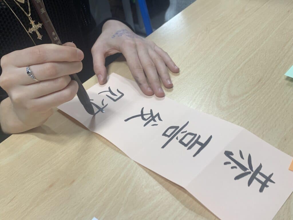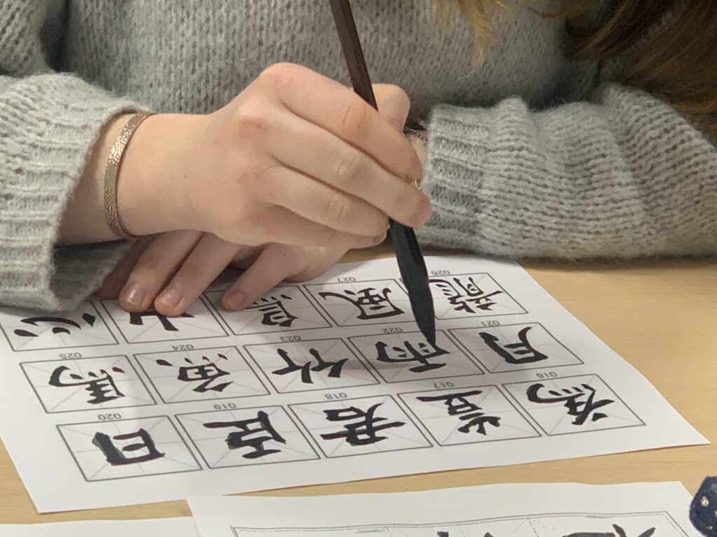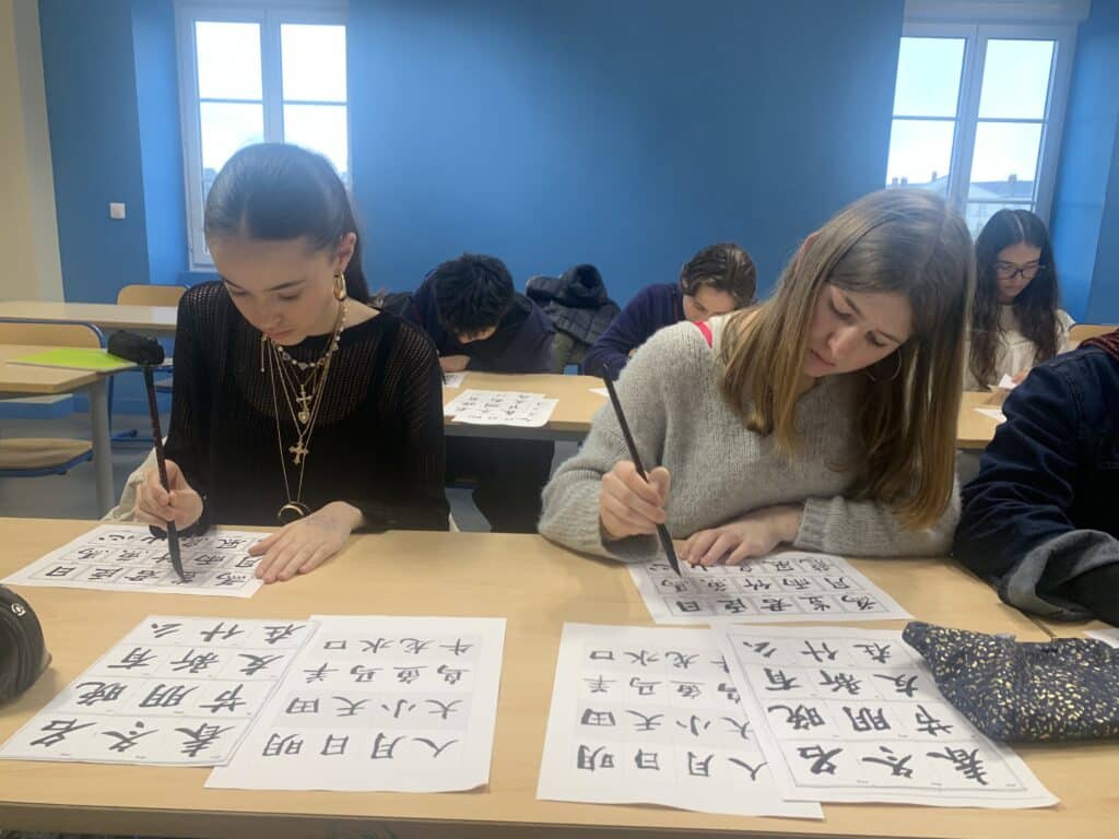 À la découverte des traits et de l’encre, les élèves ont exploré cet art traditionnel chinois. Patience et précision étaient nécessaires pour tracer chaque caractère et en comprendre l’équilibre.
