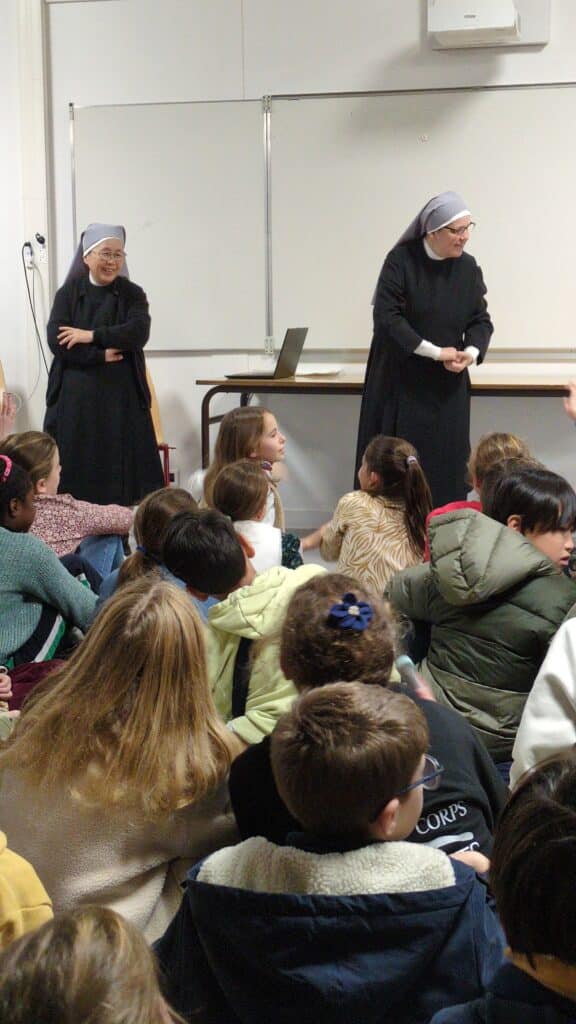 L’école a eu la chance d’accueillir deux invitées exceptionnelles : Sœur Isabelle, venue de France, et Sœur Lucia, originaire de Corée. Toutes deux appartiennent à la congrégation des Petites Sœurs des Pauvres, fondée au XIXᵉ siècle par Jeanne Jugan, figure de charité et de compassion envers les personnes âgées démunies.