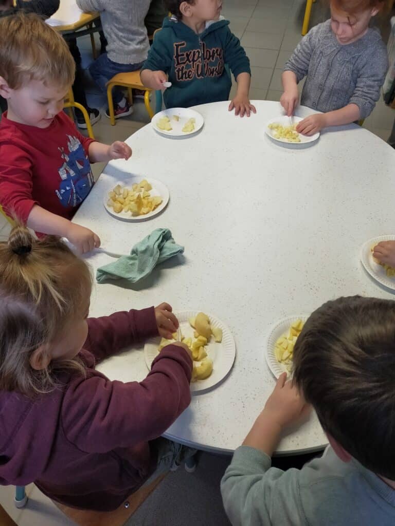 Les mamans et notre ASEM ont commencé par éplucher les pommes à l’aide d’un économe. Après s’être lavé les mains, les enfants ont découpé les pommes en petits morceaux. Ils ont même eu le droit de goûter un morceau de pomme crue… avant de verser tous les morceaux dans le faitout pour faire cuire la compote.