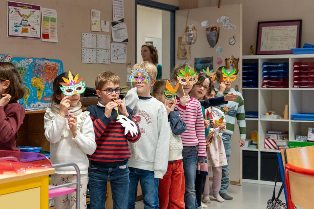 Moment très attendu, le défilé de masques réalisés en classe devait initialement se dérouler à l’extérieur. En raison de la météo, il a finalement été organisé à l’intérieur. Les élèves ont pu présenter leurs créations dans une atmosphère conviviale et joyeuse.