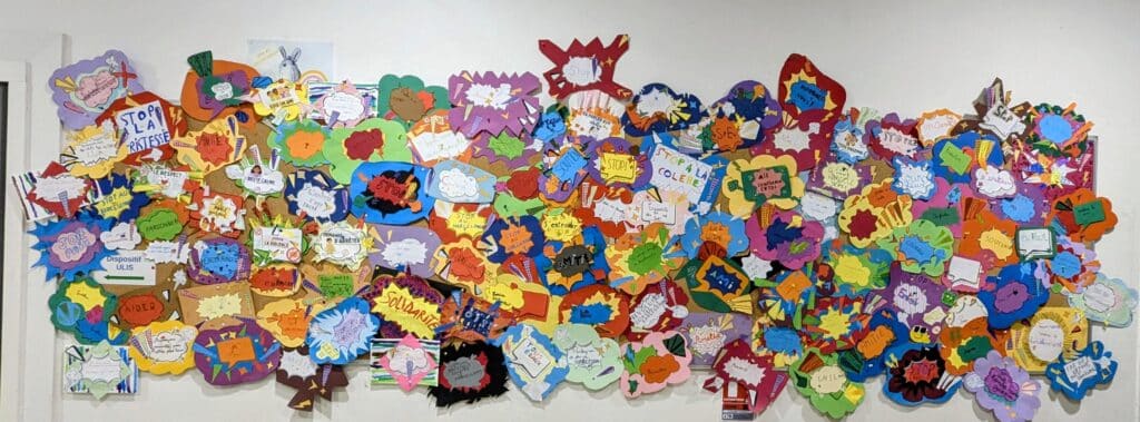 Albums jeunesse, bandes dessinées, chansons, courts-métrages… autant de supports mobilisés en classe pour amorcer le dialogue, comprendre ce qu’est le harcèlement et apprendre à y faire face. Ces réflexions ont conduit à la création de bulles de messages dans un style Pop Art, en lien avec le thème d’année de l’école : l’Art. Chaque bulle transmet un message de respect, d’entraide ou d’affirmation de soi.