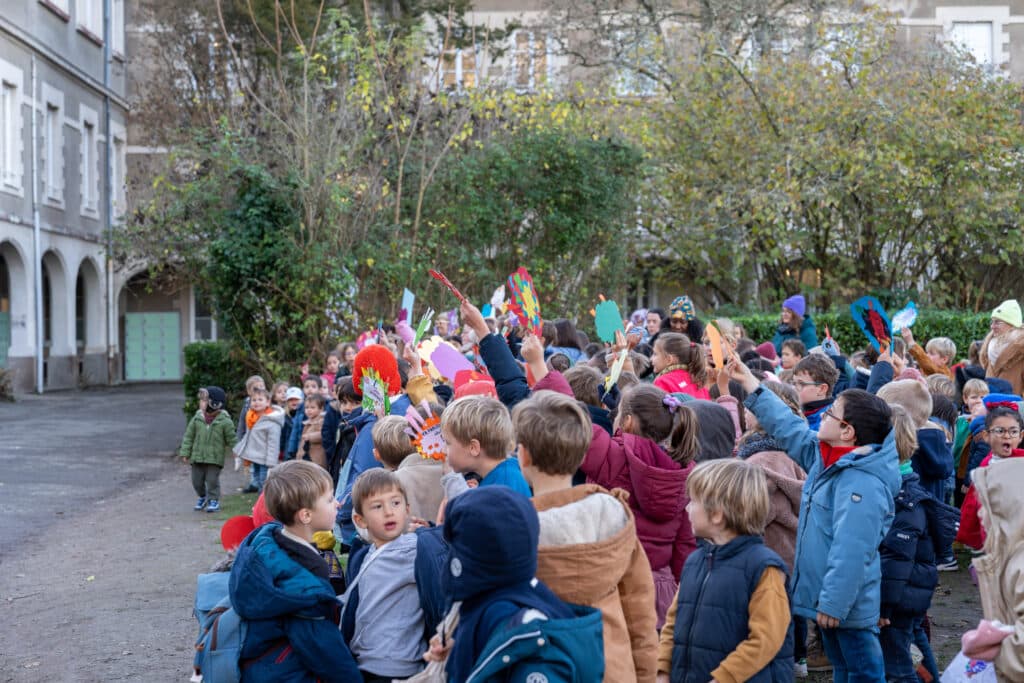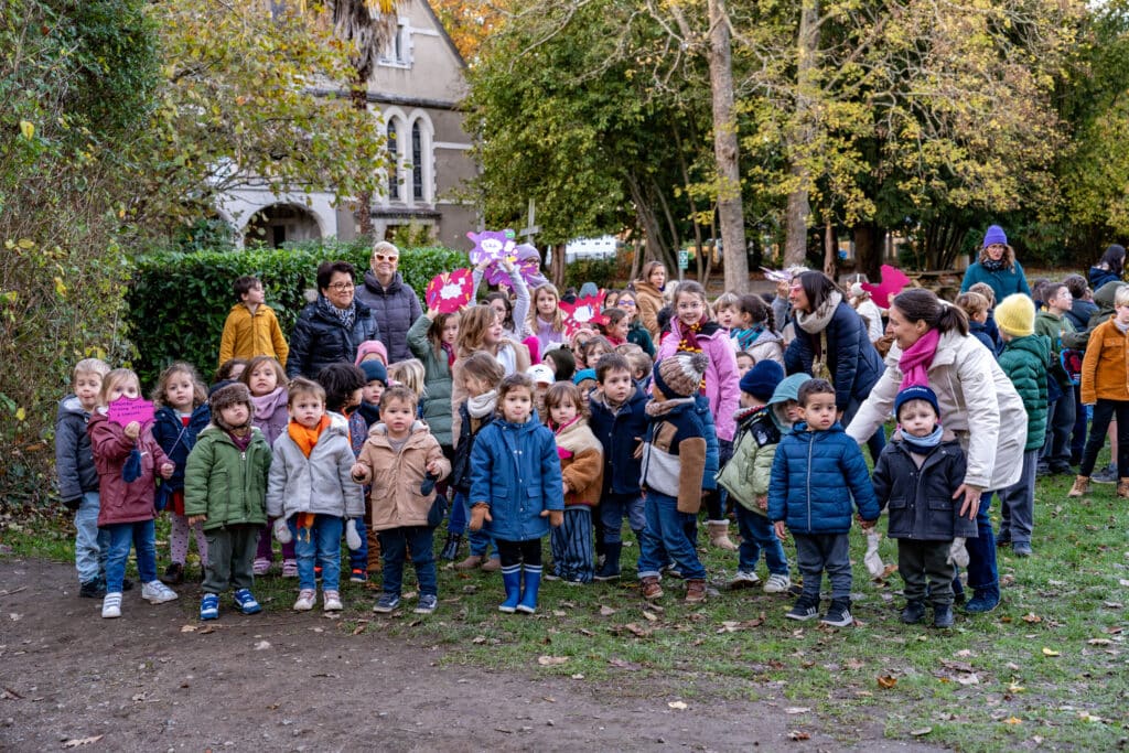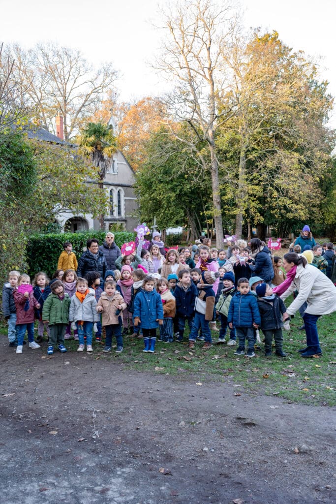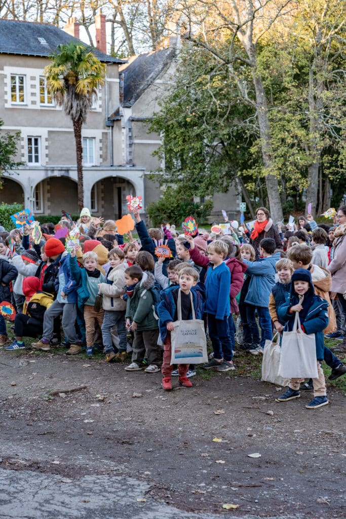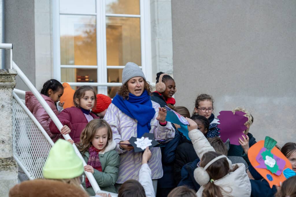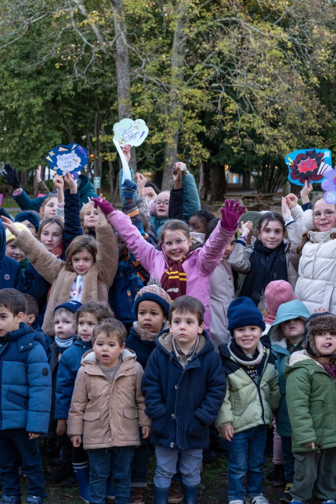 Le vendredi 21 novembre, l’ensemble des classes, de la PS au CM2, s’est rassemblé sur la pelouse face au château pour une photo collective symbolique. Vêtus de couleurs vives ou d’accessoires artistiques, les élèves ont formé un tableau vivant : certains brandissant les bulles créées en classe, d’autres tendant simplement les mains en signe d’unité et de coopération.